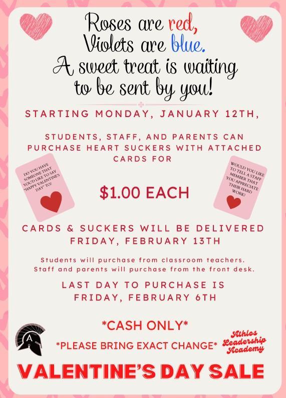 Students, families, and staff can purchase cards with suckers for $1.00 each.