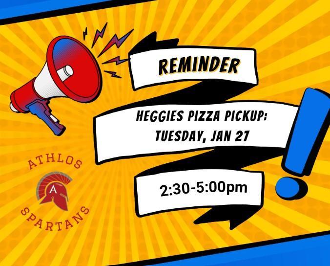 Heggies Pizza pickup is scheduled for January 27th! The hours for pick up will be 2:30-5:00pm at Door C.